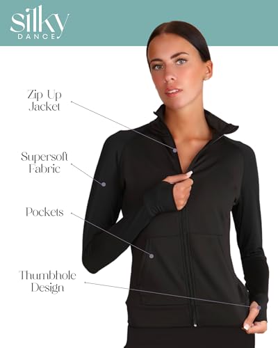 Silky Dance Zip Up Running Jacket for Women’s and Girls, Training Sports Jacket, Long Sleeve Gym Running Top, Dance Uniform Teams Black Jacket with Thumbholes and Pockets