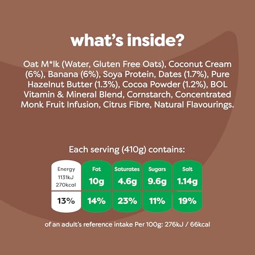 Oat M*lk (Water, Gluten Free Oats), Coconut Cream (6%), Soya Protein, Banana (5%), Cocoa Powder (1.5%), PureHazelnutButter(1.5%), Dates(1%),Minerals (Chloride, Potassium, Phosphorus, Magnesium, Calcium, Iron, Zinc, Manganese, Copper, Molybdenum, Chromium, Iodine, Selenium), Cornstarch, Concentrated Monk Fruit Infusion, Citrus Fibre, Natural Flavourings, Vitamins (A, K, Pantothenic Acid, E, C, Niacin, D, B6, Riboflavin, Thiamin, Biotin, Folate, B12), Choline.