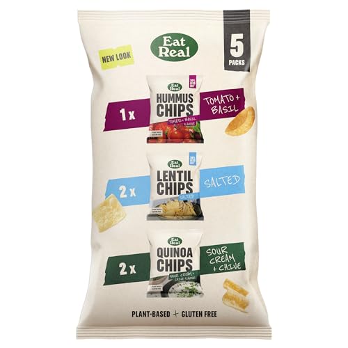 Eat Real Mixed Multipack – 2 x 18g Salted Lentil Chips, 2 x 20g Sour Cream & Chive Quinoa Chips, 1 x 22g Tomato & Basil Hummus Chips