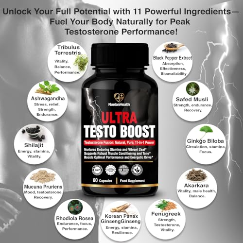 NuetonHealth Ultra Testo Boost – Tribulus, Ashwagandha, Ginseng, Shilajit, Ginkgo, Rhodiola Rosea – Premium Testosterone Supplements for Men – 11 Potent Natural Ingredients – 60 Booster Capsules