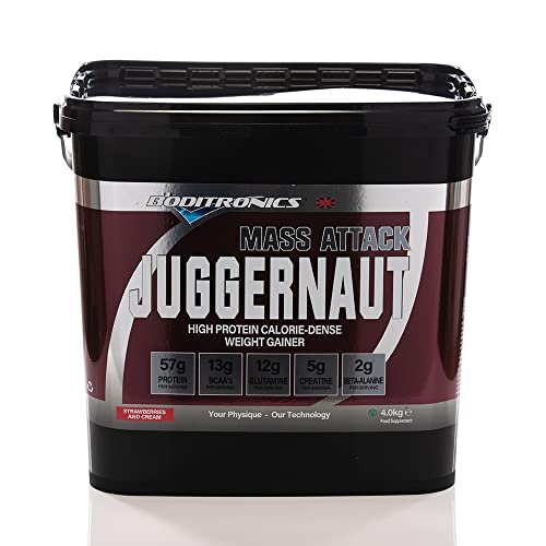 Boditronics Mass Attack Juggernaut Powder for Weight Gainer Powder, All in One Muscle Mass Gainer, High Protein Powder for Men & Women, 5g Creatine, BCAA, Glutamine & Beta Alanine (Strawberries&Cream)