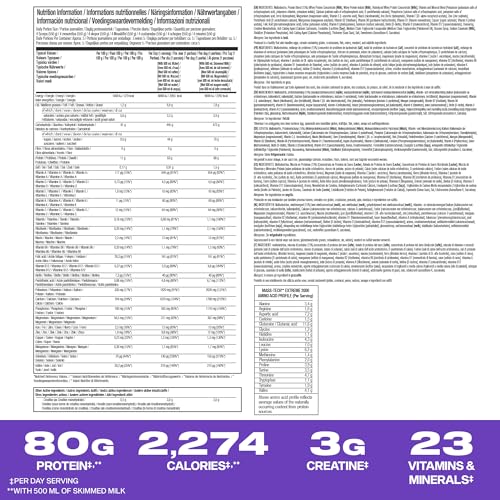 Maltodextrin, Protein Blend (15%) (Whey Protein Concentrate [Milk], Whey Protein Isolate [Milk], Hydrolyzed Whey Protein Concentrate [Milk]), Vitamin and Mineral Blend (Potassium [potassium salts of orthophosphoric acid, potassium chloride, potassium iodide], Calcium [calcium salts of orthophosphoric acid, D-pantothenate calcium], Phosphorus [calcium salts of orthophosphoric acid, potassium salts of orthophosphoric acid, ferric diphosphate], Magnesium [magnesium oxide], Vitamin C [L-ascorbic acid], Niacin [nicotinamide], Iron [ferric diphosphate], Vitamin E [DL-alpha-tocopheryl acetate], Zinc [zinc sulphate], Pantothenic Acid [D-pantothenate calcium], Manganese [manganese sulphate], Vitamin B2 [riboflavin], Vitamin B6 [pyridoxine hydrochloride], Vitamin B1 [thiamin mononitrate], Copper [cupric sulphate], Vitamin A [retinyl acetate], Folic Acid [pteroylmonoglutamic acid], Iodine [potassium iodide], Vitamin K [phylloquinone], Selenium [sodium selenate], Biotin [D-biotin], Vitamin D [cholecalciferol], Vitamin B12 [cyanocobalamin]), Flavouring, Creatine Monohydrate, Anti-Caking Agent (Calcium Carbonate), Emulsifier (Lecithins [Soy]), Medium Chain Triglyceride Encapsulate (Medium Chain Triglycerides [Palmkernel Oil], Glucose Syrup, Sodium Caseinate [Milk], Stabilizer [Potassium Phosphates], Anti-Caking Agent [Calcium Phosphates]), Thickener (Guar Gum), Salt, Sweeteners (Acesulfame K, Sucralose). Allergens: See ingredients in bold. Produced in a facility that also handles eggs, cereals containing gluten, crustaceans, fish, celery, mustard, and sulphite ingredients.