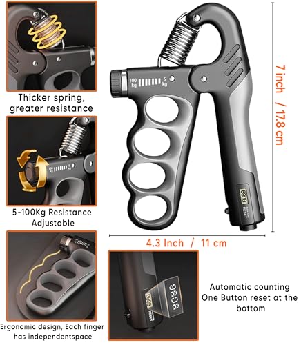 Transform Your Hand Strength with the SMIM 5-Pack Grip Strengthener Kit Unlock the full potential of your hand and forearm strength with the SMIM 5-Pack Grip Strengthener Kit. Designed to provide a comprehensive workout for your hands, wrists, and forearms, this all-in-one set is perfect for athletes, musicians, and anyone looking to enhance their grip and dexterity. Smart and Efficient Training Our hand strengthener features a built-in smart counter that automatically tracks each press, allowing you to monitor your progress effortlessly. Simply press the button to count your repetitions and rotate to reset the counter. With two adjustable hand grippers included, you can train both hands simultaneously, improving balance and strength more effectively.