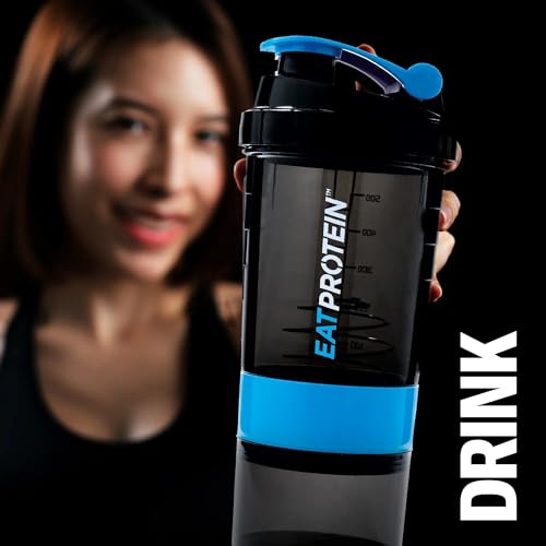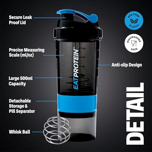 EatProtein 500ml Protein Shaker Bottle – 2 Storage Compartments & Pill Box – Leakproof Lid, Wire Ball for Smooth Shakes, BPA-Free, with Measurement Markings
