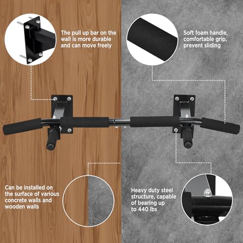GRANDMA SHARK Pull Up Bar Wall Mounted, Chin Up Bar with Foam Padded Hand Grips, Upper Body Workout Bracket Bar for Home Gym Exercise Strength Training, Heavy Duty 200kg / 440lbs