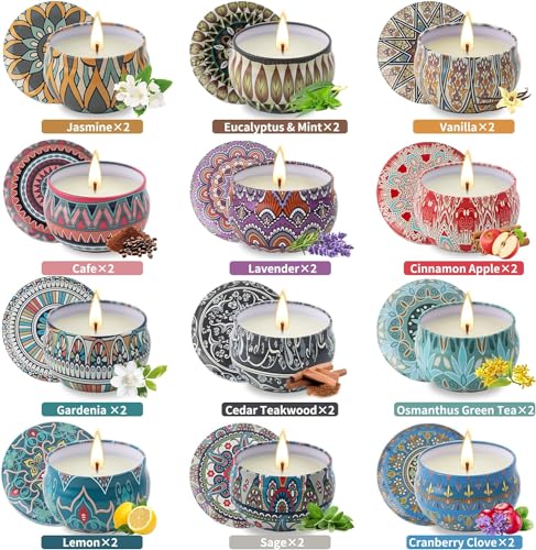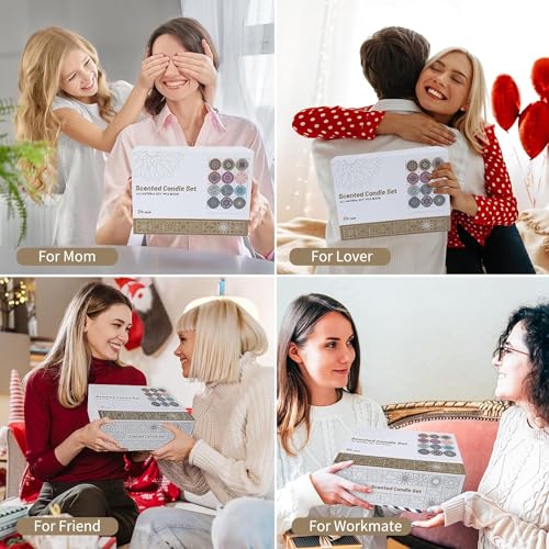 24-piece aromatherapy candle set with 12 scents you’ll love! These candles can bring about feelings of relaxation, joy, and happiness, making them perfect as a fun and unique gift for her, women, mom, wife, girlfriend, sister, and more. Safe & Natural Soy Candles Safe & Natural Soy Candles: Burn longer than paraffin wax, are cleaner, and have no black smoke and harmful chemicals. Made of 100% Lead-Free Cotton: Smokeless and uniform combustion. Recyclable candle jars The flickering candlelight brings warmth and romance When the candle burns out, it turns into a storage jar for your small items, whether it’s makeup brushes, jewelry or pins, you can find a home in it Scented Candles Gifts for Women Our scented candles are carefully crafted using premium ingredients and expert care. From selecting the scent to pouring the wax, our attention to detail results in this beautiful candle. Very Suitable as A Holiday Gift Beautiful packaging and well-designed jar patterns, perfect for birthdays, Valentine’s Day and Thanksgiving. Home scented gift candles emit a fresh scent, perfect for home, living room and office!