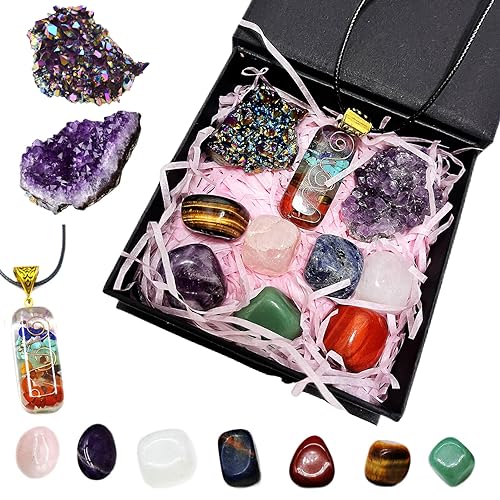 ✡【Natural Crystals and Healing Stones Kit】The essential healing stones and crystals set is a great value for a complete charka crystal kit for you to immediately get the most from you healing crystal and balance your chakras. It includes 7 chakras tumble stones (white howlite, amethyst, sodalite, green aventurine, tiger’s eye, carnelian and red jasper), 1 Natural Amethyst Clusters,1 Natural geode crystals,1 Seven Chakra stone pendent necklace,1 Gift Box