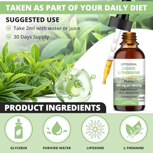 High Dosage and Maximum absorption: Each serving (2 mL) contains 300mg pure L-Theanine. Liposomal absorption means almost every compound is utilised by the body as opposed to capsules or gummies. Other Ingredients: Natural Vegetable Glycerin and Purified Water. Alcohol-free, Non-GMO, Vegan, Gluten & Soy Free.