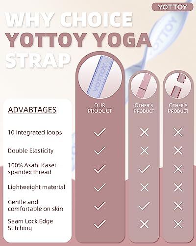 Double Stretch:YOTTOY improve your yoga practice with our premium yoga strap, which features double elasticity and has undergone over 10,000 stretch tests to ensure its stability and non-wearing stretching. With its high-density knit, seam lock edge stitching, and high load-bearing capacity, it provides exceptional strength and durability for stretching, physical therapy, and muscle rehabilitation. Perfect for beginners and experienced yogis alike.