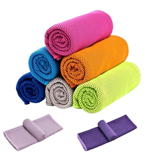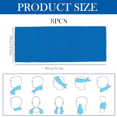 8 Pcs Cooling Towel, Gym Towels for Women and Men, Sweat Towels for Gym, Sports Towel for Yoga, Running, Hiking, Camping, and Outdoor Activities 【Instant Cooling Technology】: The cooling towel utilizes advanced cooling technology to provide instant relief during intense workouts or outdoor activities; Simply soak in water, wring out, and shake for a refreshing chill; Ideal for gym, yoga, running, and hiking 【Premium Material Composition】: Made from a blend of 80% polyester and 20% polyamide, these sweat towels are durable, soft, and highly absorbent; The fabric ensures quick drying and long-lasting performance for all your fitness needs 【Versatile Use】: Designed for multiple activities, these gym towels can be used as neck wraps, headbands, or sweat towels; Perfect for gym sessions, yoga classes, running, hiking, camping, and other outdoor adventures 【Compact and Portable】: Each cooling towel measures 30×80 cm, making it easy to carry in your gym bag or backpack; Lightweight and foldable, they are convenient for travel and on-the-go use 【Assorted Colors】: Available in a variety of vibrant colors including deep blue, orange, pink, light blue, purple, rose red, light gray, and green; Choose your favorite or mix and match for a personalized touch